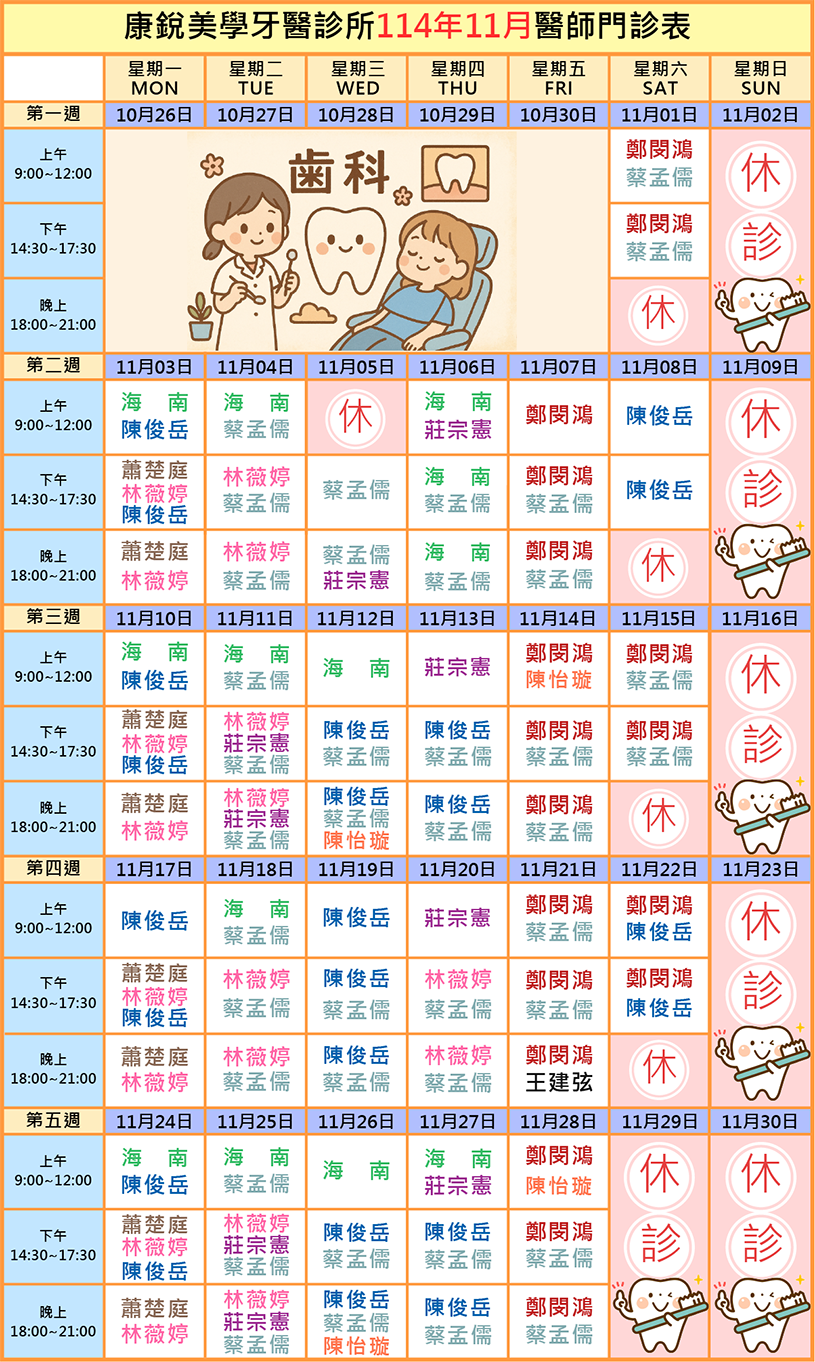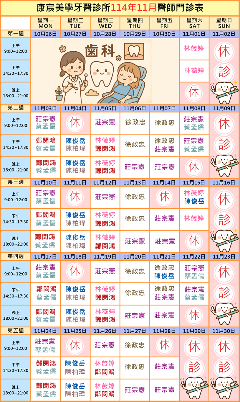 2025-11-01 114年11月份 醫師看診時間表出爐~ 114年11月份醫師看診表出爐囉~~ 康宸特別休診時間如下 每週二上午休診 每週五上午隔週休診 11/29(六) 休診 看診預約可歡迎使用網站預約系統或電話預約掛號 康宸牙醫 門診預約專線:06-5988333門診地址:台南市新化區忠孝路162號 康銳牙醫 門診預約專線:06-3117111門診地址:台南市永康區中華二路189號 Back