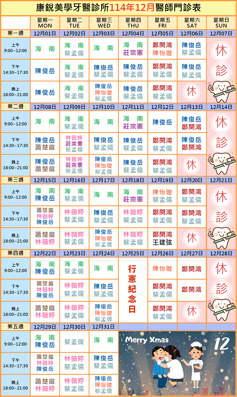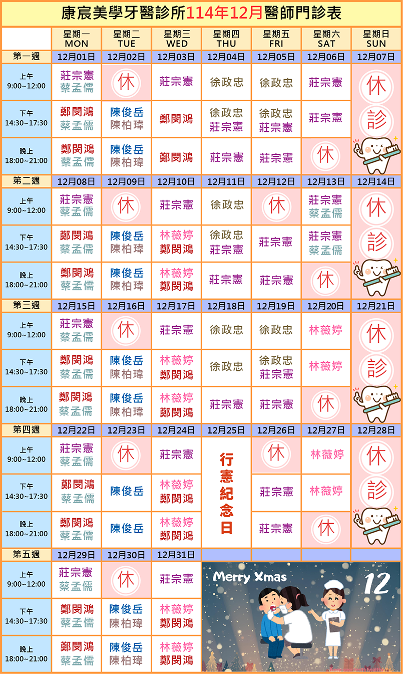 2025-12-01 114年12月份 醫師看診時間表出爐~ 114年12月份醫師看診表出爐囉~~ 康宸特別休診時間如下 每週二上午休診 每週五上午隔週休診 12/25(五) 行憲紀念日休診 看診預約可歡迎使用網站預約系統或電話預約掛號 康宸牙醫 門診預約專線:06-5988333門診地址:台南市新化區忠孝路162號 康銳牙醫 門診預約專線:06-3117111門診地址:台南市永康區中華二路189號 Back