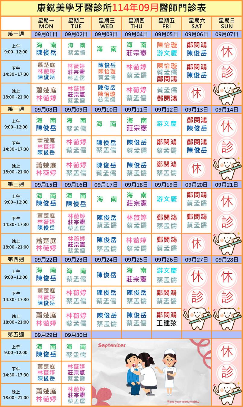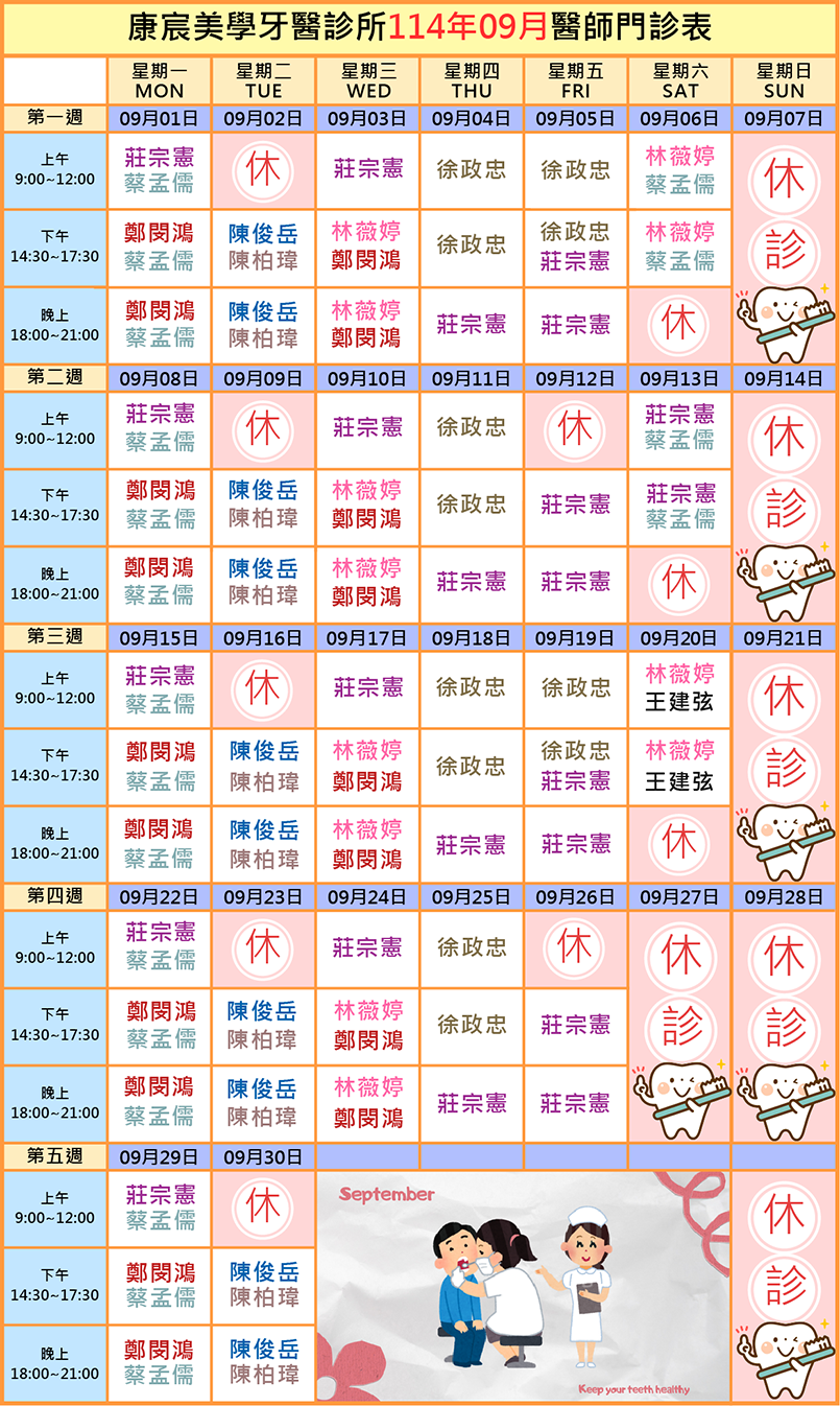 2025-09-01 114年9月份 醫師看診時間表出爐~ 114年9月份醫師看診表出爐囉~~ 康宸特別休診時間如下 每週二上午休診 每週五上午隔週休診 9/27(五) 休診 看診預約可歡迎使用網站預約系統或電話預約掛號 康宸牙醫 門診預約專線:06-5988333門診地址:台南市新化區忠孝路162號 康銳牙醫 門診預約專線:06-3117111門診地址:台南市永康區中華二路189號 Back