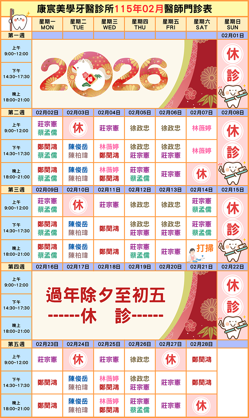 衛教保健 診療新訊 康宸美學看診表 媒體報導 衛教保健 康宸美學牙醫診所 > 衛教保健 2026-02-01 115年02月份 醫師看診時間表出爐~ 115年02月份醫師看診表出爐囉~~ 康宸特別休診時間如下 每週二上午休診 每週五上午隔週休診 2/16(除夕)~2/21(初五) 過年期間休診 看診預約可歡迎使用網站預約系統或電話預約掛號 康宸牙醫 門診預約專線:06-5988333門診地址:台南市新化區忠孝路162號 康銳牙醫 門診預約專線:06-3117111門診地址:台南市永康區中華二路189號 Back