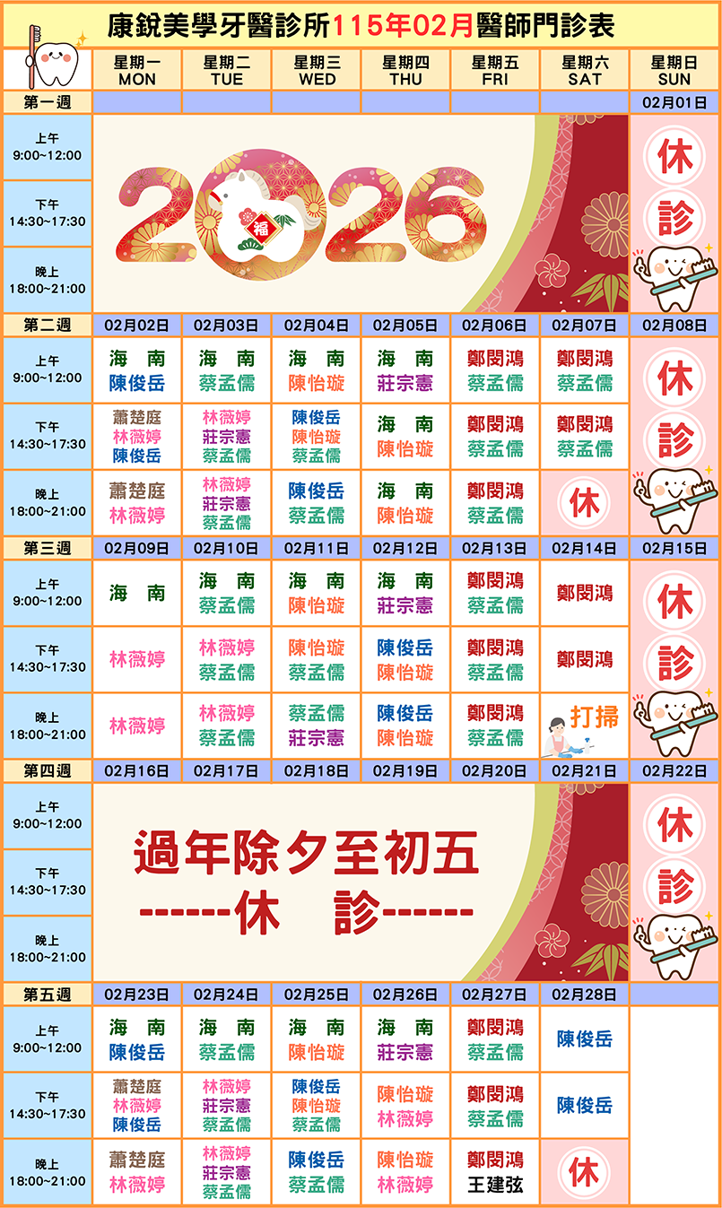 2026-02-01 115年02月份 醫師看診時間表出爐~ 115年02月份醫師看診表出爐囉~~ 康宸特別休診時間如下 每週二上午休診 每週五上午隔週休診 2/16(除夕)~2/21(初五) 過年期間休診 看診預約可歡迎使用網站預約系統或電話預約掛號 康宸牙醫 門診預約專線:06-5988333門診地址:台南市新化區忠孝路162號 康銳牙醫 門診預約專線:06-3117111門診地址:台南市永康區中華二路189號 Back