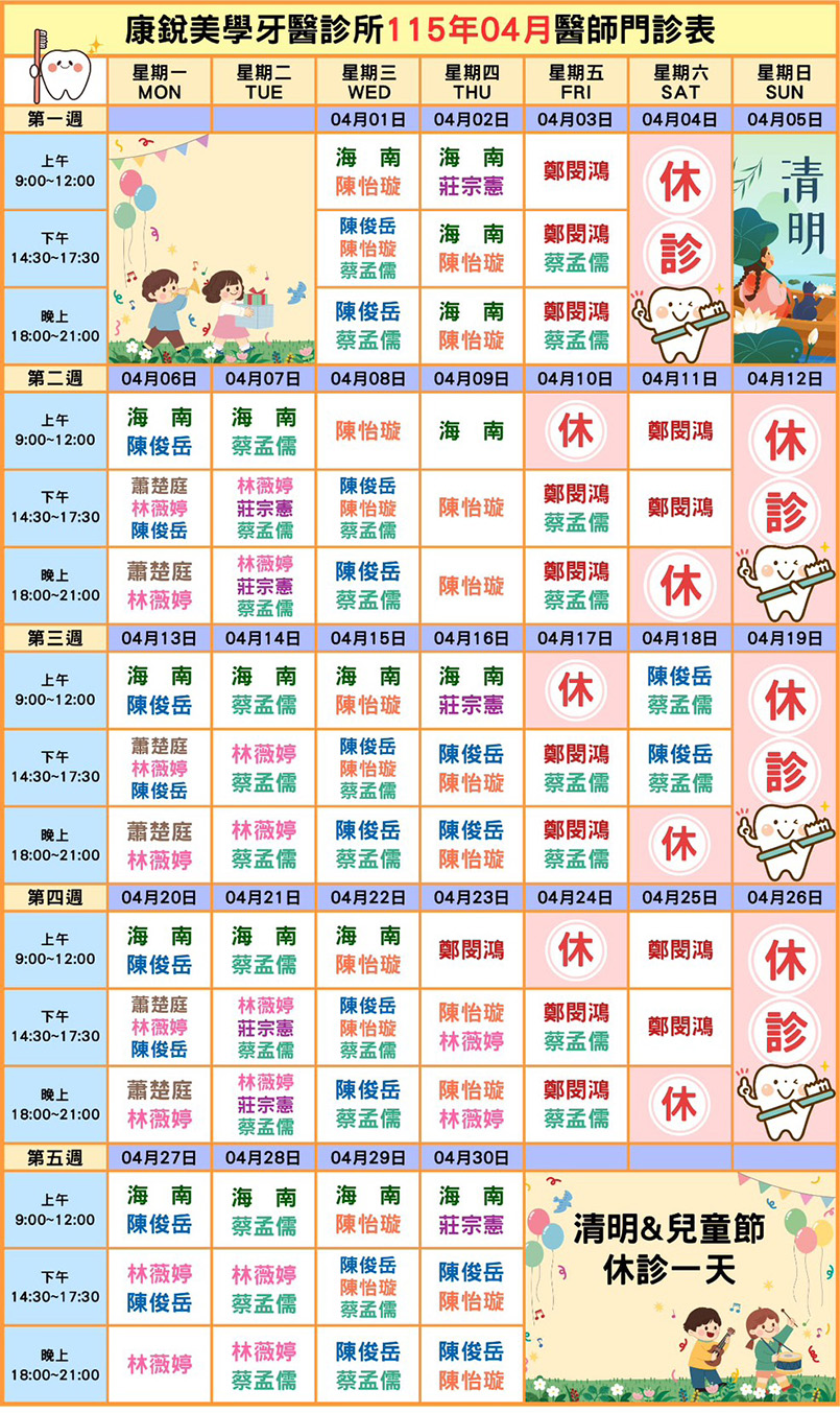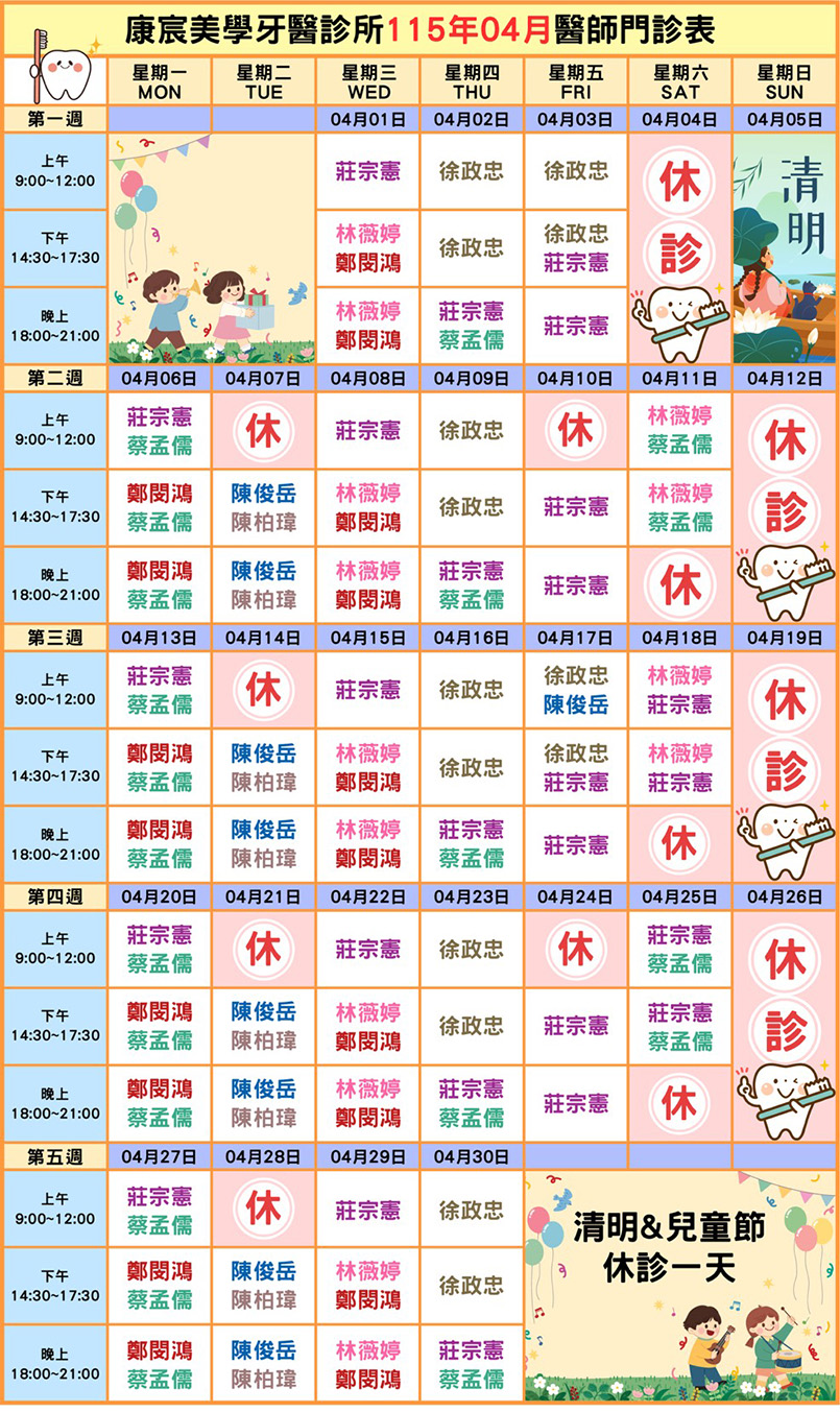 衛教保健 診療新訊 康宸美學看診表 媒體報導 衛教保健 康宸美學牙醫診所 > 衛教保健 2026-03-30 115年04月份 醫師看診時間表出爐~ 115年04月份醫師看診表出爐囉~~ 康宸特別休診時間如下 每週二上午休診 每週五上午隔週休診 4/4(六)清明&兒童節休診一天 看診預約可歡迎使用網站預約系統或電話預約掛號 康宸牙醫 門診預約專線:06-5988333門診地址:台南市新化區忠孝路162號 康銳牙醫 門診預約專線:06-3117111門診地址:台南市永康區中華二路189號 Back